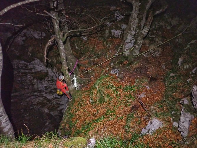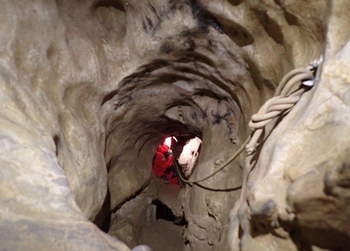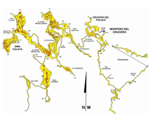 Se trata de un recorrido completo en el cual pondremos en práctica todas las maniobras de progresión por cuerda vertical, ascenso, descenso con fraccionamientos y pasos por gateras, meandros junto con zonas de galerías amplias que pondrán a prueba nuestras técnicas de progresión por cavidad ya que deberemos superar los dos pozos de 15 metros de acceso a través de la boca de Crucero, los meandros de esta zona y el Pozo de 27 metros de salida por Calaca.